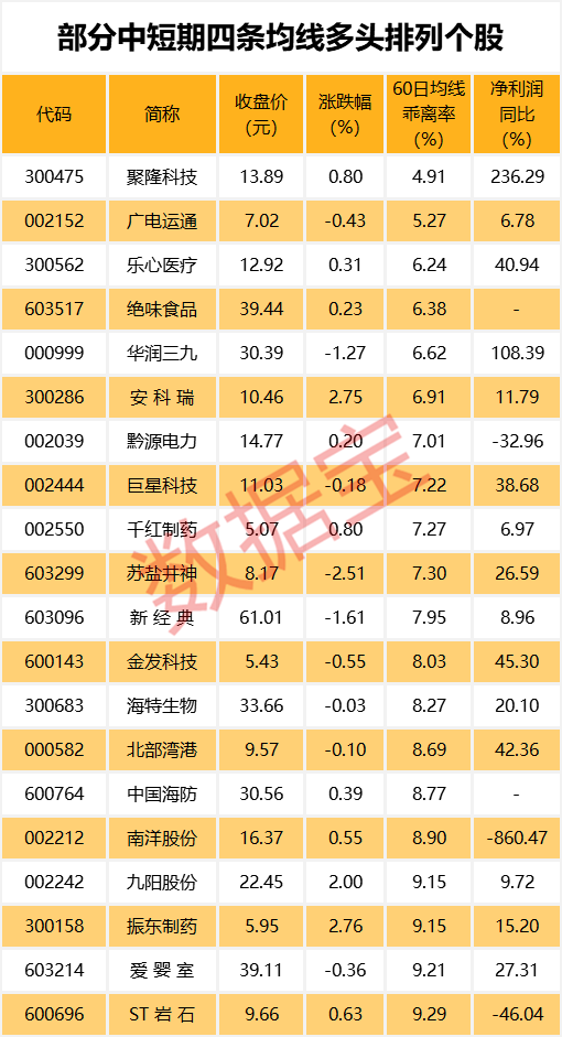 另外,66只个股不但上述四条均线呈多头排列,120日、250日均线也呈多头排列。数据显示,这些个股中同和药业、华润三九、宝德股份与250日均线的乖离率最小,分别为16.68%、17.62%、19.71%。