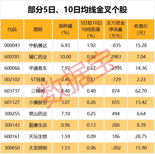 截至8月27日收盘,有11只A股的5日均线主动上穿10日均线,其中中航善达、辅仁药业、宇通客车等个股的5日均线较10日均线距离最大,分别达1.92%、0.92%、0.67%。值得注意的是,辅仁药业、三棵树、小康股份等个股主力资金净流入居前。