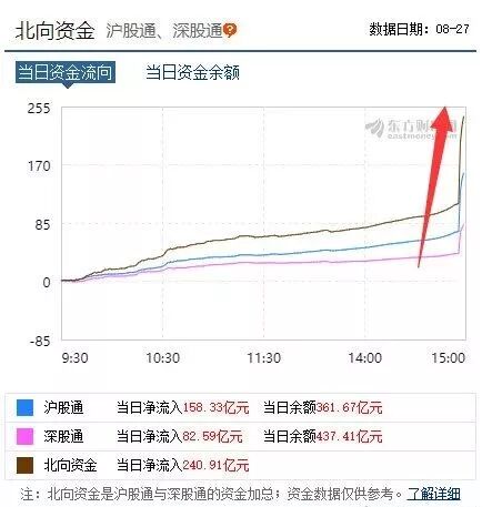 可以看看北上资金的最后,在集合竞价时一分钟左右净流入额为110亿,随后北上资金净流入额急速达到240亿,市场一度欢呼。