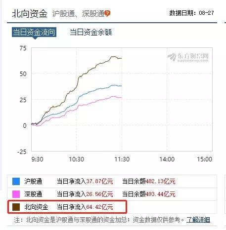 昨日上午北上资金大举买入近65亿元,其中沪股通净买入37.87亿元,深股通净买入26.56亿元。