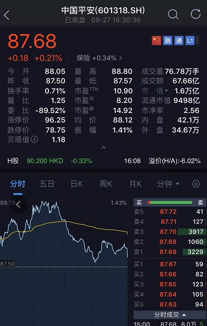 中国平安从涨逾0.4%到最后只涨0.21%,最后一分钟放量成交7.98万手,涉资7亿元。
