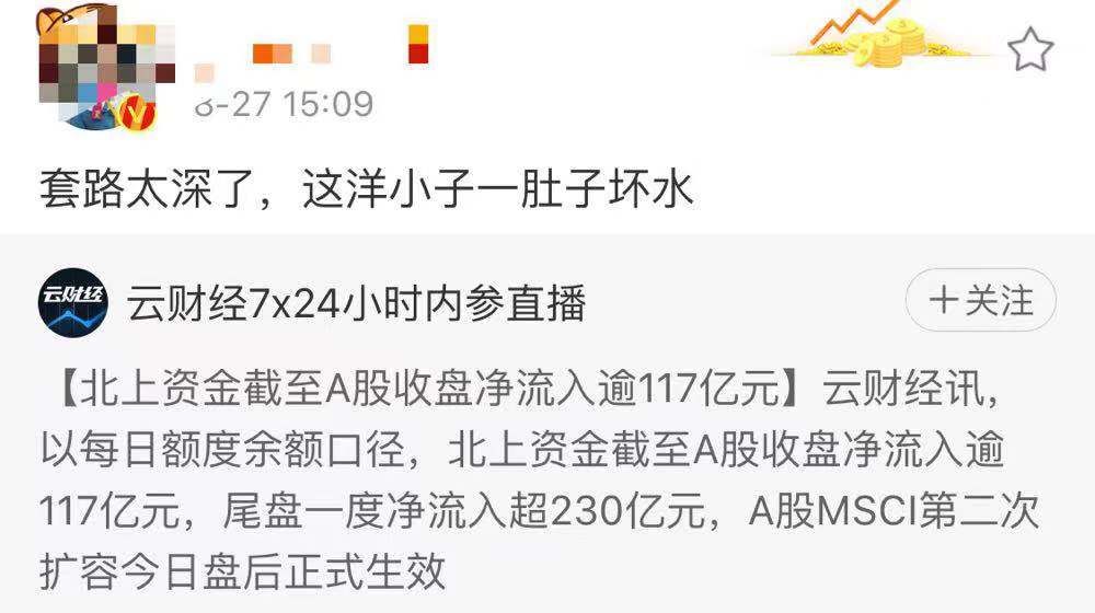 但随后却泼下一盆冷水:收盘数据显示,北上资金最终净流入额为117亿,这意味着,在尾盘有120多亿资金进行了卖出。