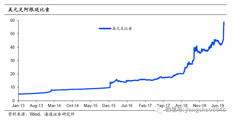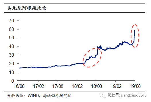 投资者担忧加剧,引发资本加速外逃,导致本币大幅贬值。民粹候选人的意外领先,一方面引发市场对阿根廷经济再次陷入困境的担忧加剧。另一方面,海外投资者预期实施宽松政策后本币将继续贬值,这无疑加剧了资本外逃。受到海外投资者大量抛售本国货币的影响,阿根廷汇率在短期出现大幅贬值。