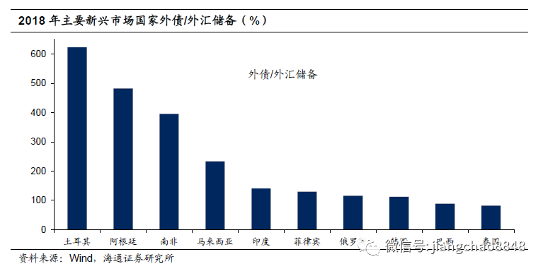 但是需要警惕外债规模过高的新兴市场国家,因为偿债能力同样受到质疑。国内政局的变动只是海外资金流出的导火索,海外投资者对阿根廷丧失投资信心的本质是因为阿根廷长期积累的高外债,偿债能力太弱使得阿根廷一有风吹草动就会引发资本恐慌外逃。而从外债/外汇储备规模来看,土耳其、南非、马来西亚分别达到623.0%、395.7%、233.6%,这些国家的外债规模也较高,需要警惕负面冲击导致的资本外逃。