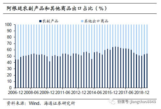 但阿根廷的出口结构单一,难以获得持续的贸易顺差。阿根廷拥有适合农业发展和农产品出口的天然环境,因此农副产品在国际贸易中更具竞争力。同时,随着阿根廷农业的发展,规模效应突显,生产成本降低,农副产品成为阿根廷出口贸易的主要商品。近10年来,阿根廷农副产品出口占总出口的比重基本保持在五成以上。依赖农副产品的出口结构使得阿根廷的贸易收支受到天气影响较大并且难以实现大规模的增长,2017年和2018年阿根廷贸易逆差规模分别达到83亿美元和38亿美元。