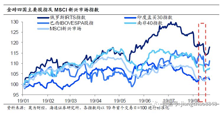 受到阿根廷影响,新兴市场国家股市一度出现下跌,随后逐步企稳。在阿根廷市场巨震影响下,新兴市场国家的主要股指均出现一定幅度的波动,如8月12日巴西IBOVESPA指数和南非40指数分别收跌-2.9%和-2.4%。但此后各国股市均逐步企稳回升,反映股市短期下跌主要受情绪影响,阿根廷对各国的传导效应有限。