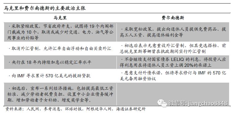 民粹主义候选人费尔南德斯的政治主张与现任马克里大相径庭。马克里于15年当选阿根廷总统。其政府采用紧缩政策力求平衡财政,试图通过将19个内阁部门裁减为10个、取消或减少交通、电力、油气等公用事业补贴等方式节省政府开支。而民粹政府则主张采取宽松政策,提出提高工人工资、提高退休福利金、向退休人员提供免费药品等社会福利措施。外汇管制方面,马克里政府在15年底即宣布取消外汇管制,费尔南德斯团队虽在初选后表示无意重设外汇管制,但其竞选搭档、前总统克里斯蒂娜就曾在执政期间实行严格的外汇管制。此外,为应对汇率暴跌的危机,马克里政府在18年持续加息,并向IMF求助并获批了累计570亿美元的援助贷款以缓解国内的金融困境。而费尔南德斯曾表示不会继续支付国家债券LELIQ的利息,并将寻求修订与IMF的570亿美元的融资协议。