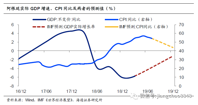 改革阵痛期后经济显现企稳迹象,但阿根廷目前经济整体环境仍较脆弱。受货币贬值影响,阿根廷自18年年中以来通胀迅速推升,同时进入实际GDP负增长区间。18年9月,马克里宣布大幅缩减政府部门等新紧缩措施进行自救。此后,CPI在19年5月触顶回落,GDP增速也呈现出企稳回升的态势,改革初见成效。根据IMF在19年4月发布的预测,19年阿根廷CPI将继续回落,GDP实际增速预计增长至-1.2%,指向市场对阿根廷经济经历改革阵痛期后重新企稳的预期。但阿根廷政府仍面临严重的财政赤字与外债负担,叠加高通胀、低汇率,整体经济和金融环境仍较为脆弱。