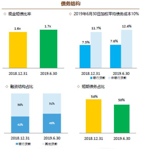 2018年底,公司有息短期负债270亿元,同期现金结余为230亿元,现金基本上覆盖短期负债;净负债率则从2017年的339.5%降至2018年的58.1%,经营活动现金流净额转负为正。
