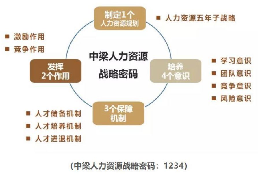中梁内部有一套完善的人力资源战略密码“1234”,旨在为企业打造一个优秀的人力资源体系、一大批高素质经营人才,夯实企业的组织能力基础。