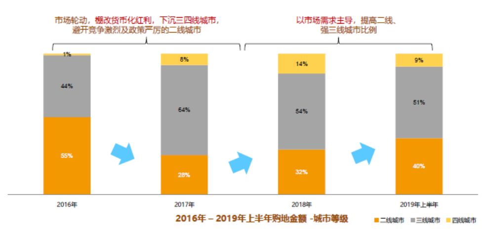 今年上半年,中梁新增项目的布局,更是非常明显地体现出其在城市布局上的轮动。公告显示,今年上半年,中梁新进入的18个城市,大部分是二线和强三线城市,收购的70个新项目,二线城市占40%,三线城市占51%,四线仅占9%!