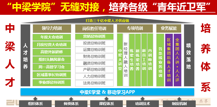 同时,整个集团所有知识经验的积累、模式模板,也由中梁学院来牵头整合起来,以便于知识共享。