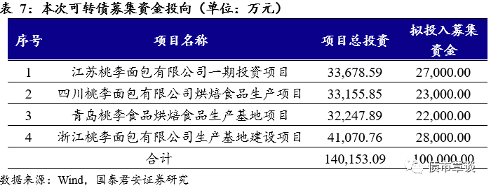 公司本次发行可转债拟募集资金总额不超过10.00亿元,将主要用于江苏桃李面包有限公司一期投资项目、四川桃李面包有限公司烘焙食品生产项目、青岛桃李食品烘焙食品生产基地项目、浙江桃李面包有限公司生产基地建设项目。