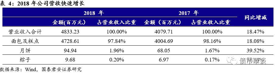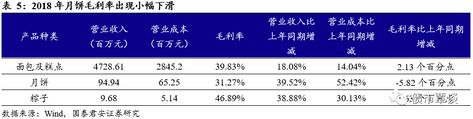 畅销产品保持快速增长,营业收入稳定提高。公司主要从事食品生产经营,具体产品可分为面包及糕点、月饼和粽子三类食品。面包及糕点为公司核心产品,2018年营收占比97.84%,实现营业收入472,861.10万元,同比增加72,392.05万元,增长18.08%。天然酵母、醇熟等明星产品市场认可度高,豆小方起酥面包等新款产品也呈现较高速增长,综合竞争力继续提升;针对我国传统节假日中秋节与端午开发的节日食品月饼和粽子在2018年分别实现营业收入9,493.93万元和967.73万元,同比增长39.51%和38.93%。其中,京式月饼等畅销产品继续保持快速增长,展现出较大的发展潜力和市场空间。月饼的毛利率在2018年有所下滑,主要原因是产品种类较多,原材料及人工成本都大幅上升,但因为占比较低,对公司整体毛利率的提升无明显影响。