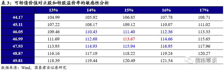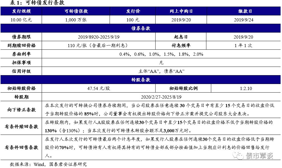 【条款分析】本次可转债发行期限6年,票息为递进式(0.4%,0.6%,1.0%,1.5%,1.8%,2.0%),到期回售价为110元(含最后一期利息)。主体评级为AA,转债评级为AA,按照6年AA中债企业债 YTM 4.92%计算,纯债价值为86.29元,YTM为2.45%。发行6个月后进入转股期,初始转股价47.54元,9月17日收盘价为46.99元,初始平价98.84元。条款方面,15/30+85%的下修条款,15/30+130%的有条件赎回条款,30/30+70%的回售条款。可转债潜在稀释比率约为3.19%。