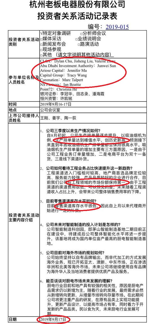 4、老板电器公布了一份调研公告,关键位置我都用红色圈出来了。一堆老外加上几个中资机构调研了老板电器,公司产量达到峰值、库存低、又找到了精装修这个工程渠道。即今天老板电器大涨4.5%,如果真的能打动老外来买买买,我估计就能赚钱了。