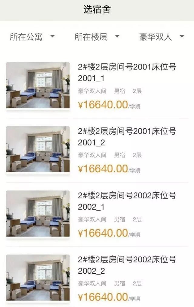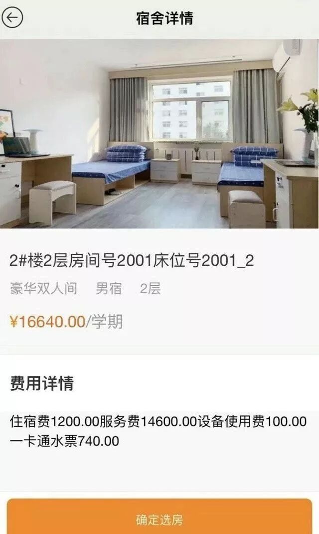从学生提供的截图中看到,一间标为“豪华双人间”的寝室,价格为16640/学期,费用详情显示为住宿费1200元,服务费14600元,设备使用费100元,一卡通水票740元。此外,四人间的寝室标价3840/学期,其中住宿费1200元,服务费1800元。