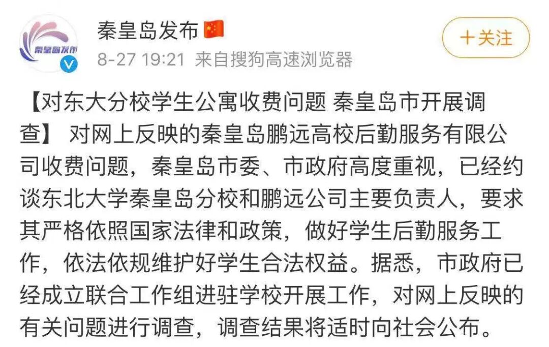 8月27日,据河北省秦皇岛市委宣传部互联网信息办公室官方微博(@秦皇岛发布)消息,针对网上反映的秦皇岛鹏远高校后勤服务有限公司收费问题,秦皇岛市委、市政府高度重视,已经约谈东北大学秦皇岛分校和鹏远公司主要负责人,要求其严格依照国家法律和政策,做好学生后勤服务工作,依法依规维护好学生合法权益。据悉,市政府已经成立联合工作组进驻学校开展工作,对网上反映的有关问题进行调查,调查结果将适时向社会公布。