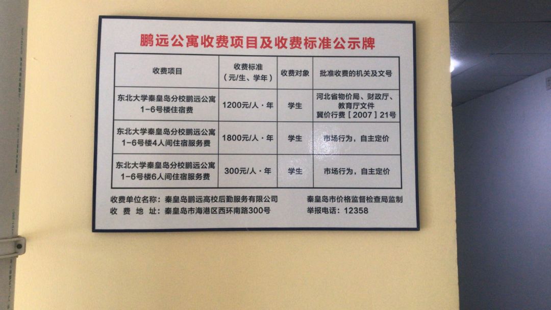 根据河北省物价局的相关规定,收费前必须按管理权限到物价部门办理《收费许可证》,亮证收费,并向学生开具合法的票据。且收费标准应提前公示,严格按照《教育收费公示制度》规定,长期在收费场所的醒目位置将学生公寓的等级、收费标准、批准文号等内容进行公示。6月25日,鹏远挂出收费标准公示牌,右下角标注有“秦皇岛市价格监督检查局监制”的字样。然而当学生就此向价监局求证后却发现,鹏远的定价并没有经过价监局审批。随后不久,该公示牌右下角的“价监局监制”便被用白纸遮住。