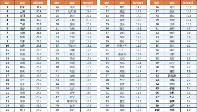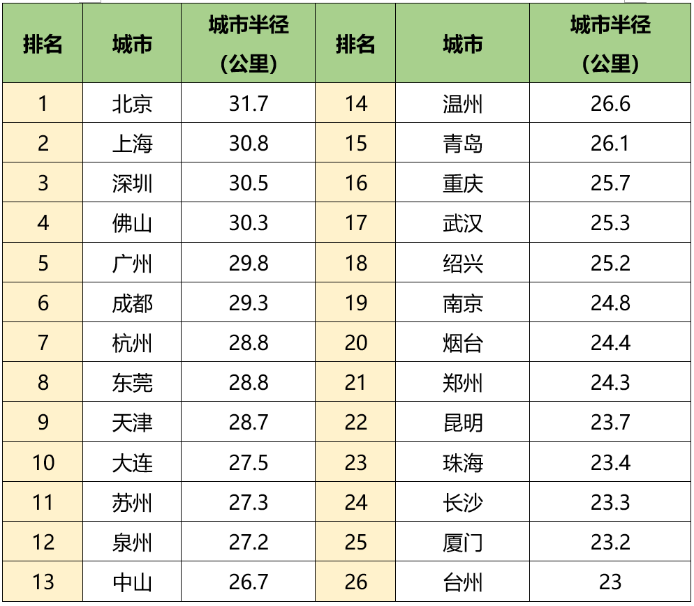 更有意思的是,滴滴出行去年发布了一个“出行半径”排行榜,发现中国绝大多数城市的极限通勤半径也是30公里左右。滴滴对“出行半径”的定义是:以市中心为原点,绝大多数(超过90%)的出行起点或终点都分布在以此为半径的圆圈之内。