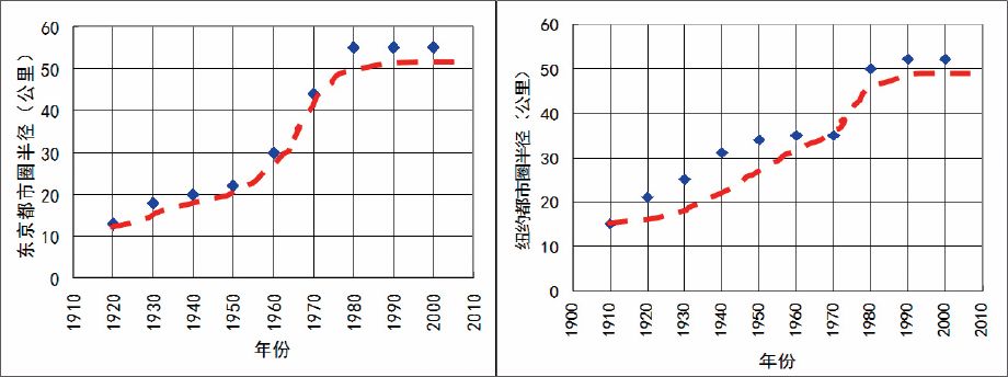在世界范围内,这个数字同样具备独特的魅力。根据“城市进化论”的报道,北京城市规划设计研究院李伟、伍毅敏的研究发现,50公里已成为世界城市发展的新边界:1980年,东京、纽约两个都市圈在经历近一个世纪的扩张后,其长轴半径均稳定在50公里附近。