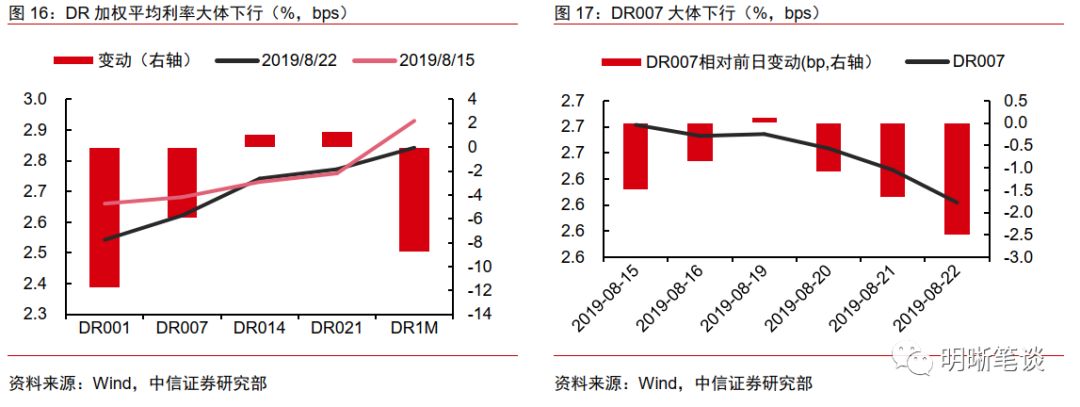 上周五(8月16日)至本周四(8月22日)利率小幅上行,债市走弱。货币市场方面,受到政府债券发行缴款以及MLF到期的流动性冲击,央行连续进行公开市场操作进行对冲,但资金面依旧相对偏松,各期限货币资金利率大体下行;利率债方面,受贷款市场报价利率下行幅度不及预期与财政可能上调新增专项债额度预期的影响,国债现券收益率大体上行。国债期货自上周四起涨跌互现,最终小幅收跌。整体而言,本周债市震荡走弱。