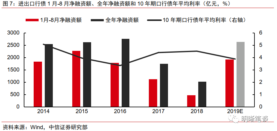 进出口行债1月至今净融资规模已达1923.9亿元,远超过去两年同期的净融资规模,与2014年至2016年同期1970亿元的口行债平均净融资规模较为接近,而2014年至2016年口行债平均全年净融资额为2650.9亿元,因此预测2019年口行债全年净融资额约为2650亿元,即年内还需净融资726.1亿元。加之口行债将在年内到期的规模为1663.5亿元,因而预测口行债在年内还将发行2389.6亿元。