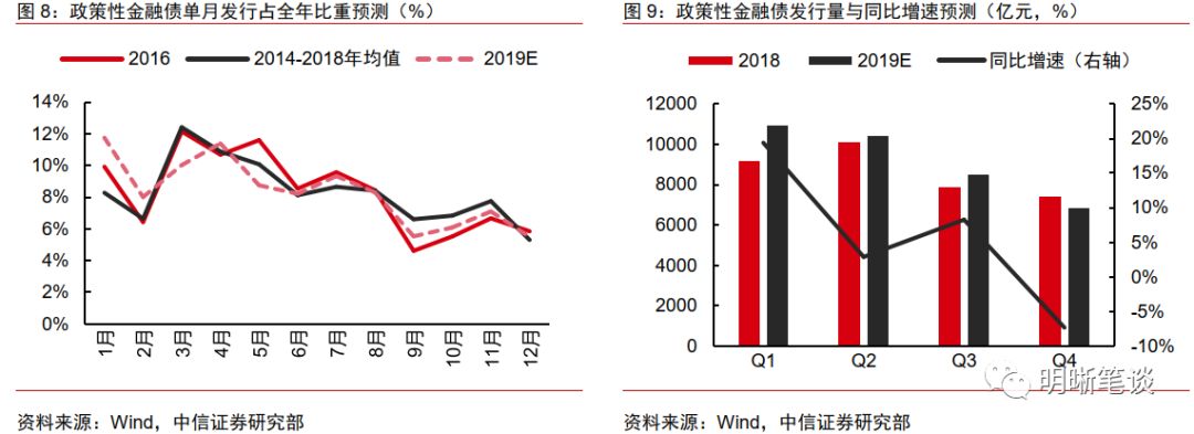 预计政策性金融债的供给压力也主要集中在8月。由于政策性金融债的发行走向与2016年的情形较为接近,因此,参考2014-2018,特别是2016年政金债的发行数据,预测8、9、10、11、12月政金债发行量在全年的占比分别为8.31%、5.53%、6.09%、7.1%、5.5%,预测2019年第三季度政金债发行量为8534亿元,同比增加8.27%;预计2019年第四季度政金债发行量为6883亿元,同比减少7.31%。与国债相似,预计政金债在8月的供给压力较为集中,后续压力不大。