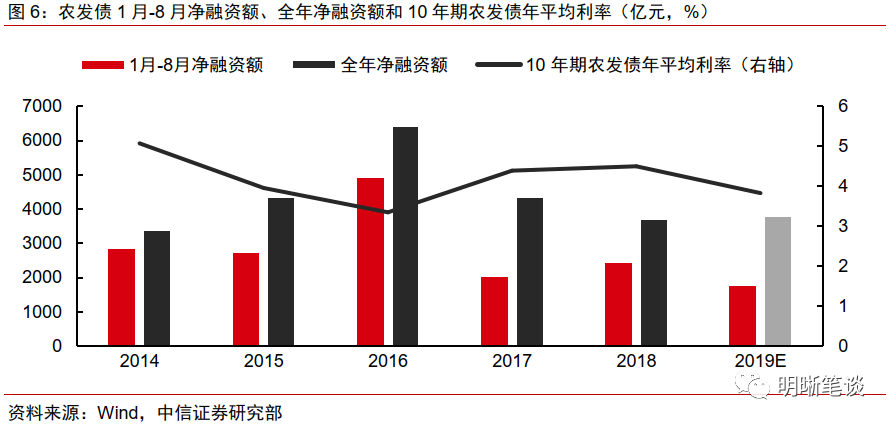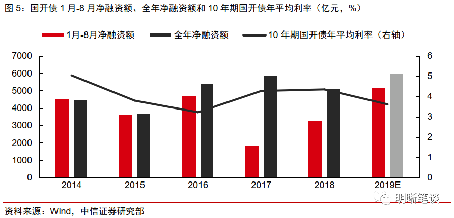 2019年1月至今,国开债净融资额为5148.5亿元,与2016年同期的4702亿元最为接近。同时,2016年和2019年所处的利率区间也较为相似。目前2019年国开债净融资额相较2016年增长9.48%,而2016年国开债全年净融资额为5429.62亿元,因此预测国开债2019全年净融资额约为6000亿元,即年内还需净融资851.5亿元。加之国开债将在年内到期的规模为3001.3亿元,因而预测国开债在年内还将发行3852.8亿元。