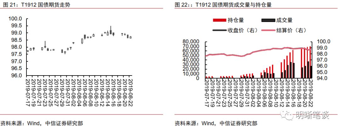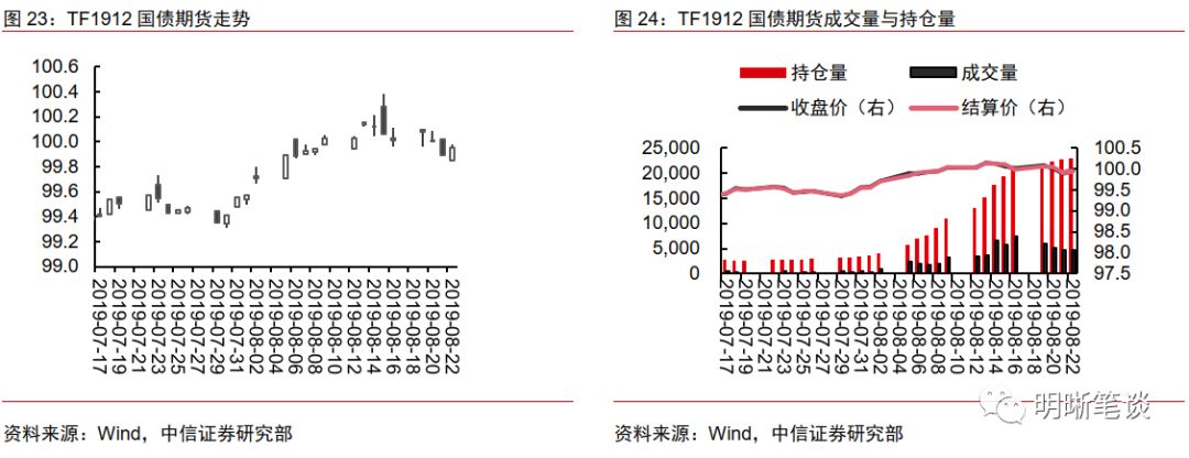 上周五至本周四,国债期货涨跌互现,在震荡中小幅走低。10 年期国债期货主力合约 T1912近五个交易日收跌 0.3%(以收盘价计)。其中,上周五T1912开盘一路下跌,收盘前稍有拉升,当日收跌0.14%;周一T1912开盘后保持震荡,午盘后保持上涨趋势,全天收涨0.12%;周二T1912全天基本保持震荡,临近尾盘时下挫明显,全天收跌0.06%;周三T1912开盘后迅速走低,最终全天大跌0.25%;周四T1912开盘后有所上涨,而后保持震荡,全天收涨0.06%。
