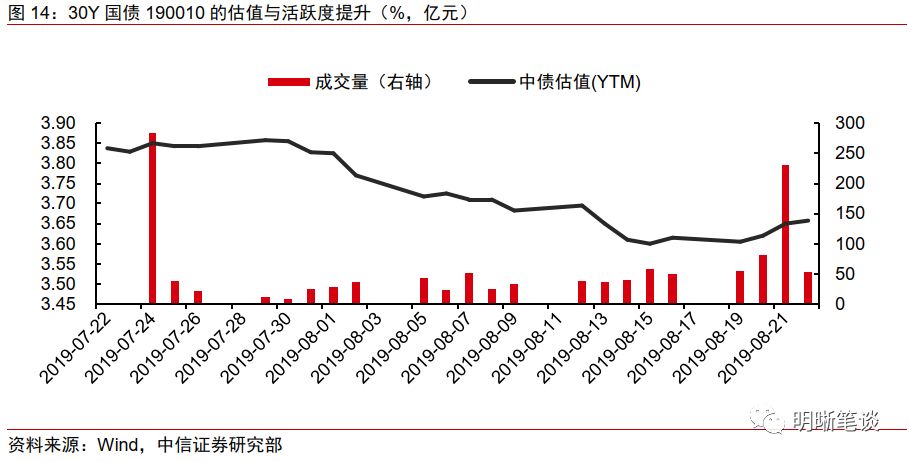 在基本面趋弱,信用被动收紧,货币宽松适度的环境下,资产荒才是当前债市的核心逻辑。资产荒从信用债一级市场和30年期国债二级市场的表现中可见一斑。一是信用债市场资质“下沉”,优质资产的价格已经相对较高,导致部分资质较好的AA+信用债的配置需求也开始上升,大约在7、8月份已经有了很明显的体现。另一方面30年期国债也开始有所躁动,多次出现日度成交放量的情况,利率也有明显的下行趋势,这些都是优质资产相对稀缺的表现,预计资产荒将是今年债市的核心逻辑。