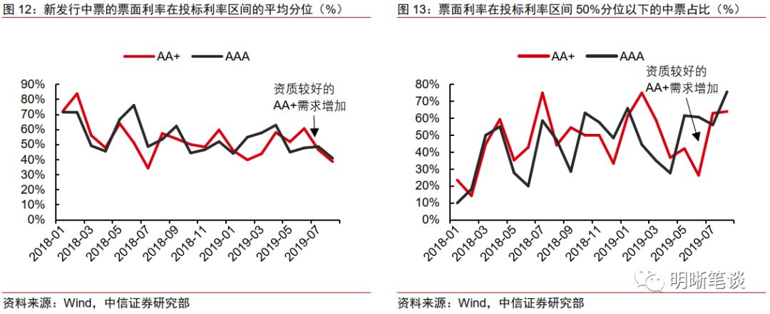 中小银行风险事件以来,高等级信用债一级市场需求火热。在信用债发行时,一般会给出投标利率的区间,观察最终的中标利率即票面利率在投标区间中的位置,可以很大程度上反映一只债券的受欢迎程度。如果需求明显大于供给,那么中标利率将会向投标利率的下限趋近,反之将趋向区间上沿。剔除掉部分票面利率未落在区间之内的券后,我们对今年发行的中期票据进行统计,发现较高等级信用债的票面利率在投标区间中的分位处于下行趋势当中,说明受到了投资者的不断追捧。同样,我们发现位于高等级信用债发行时票面利率位于区间下半部分的比重越来越高。