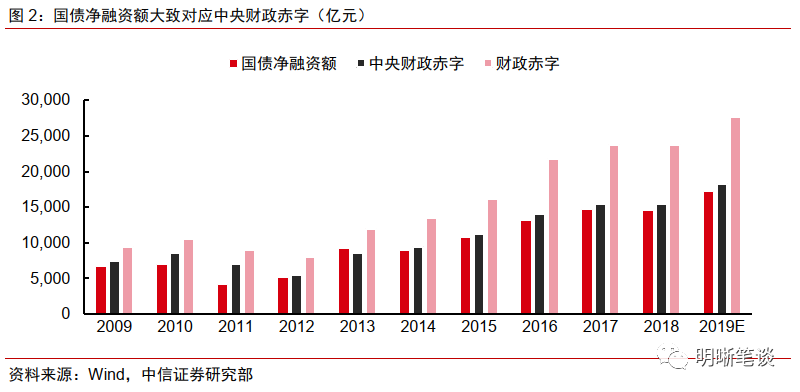 国债的净融资额是中央弥补财政赤字的主要来源, 2014年至2018年这5年国债净融资额与中央财政赤字的差值与中央财政赤字的比值稳定在6%左右(平均为5.76%), 2019年中央财政赤字目标为1.83万亿元,因此预计2019年全年国债净融资额为1.72万亿元。截至2019年8月21日,今年国债的净融资额已达8254亿元,因此国债年内预计还需净融资8991亿元。加之年内还有6542亿元的到期国债,预计年内还需发行国债1.55万亿元,去年同期发行国债1.4万亿,同比增加10.50%。