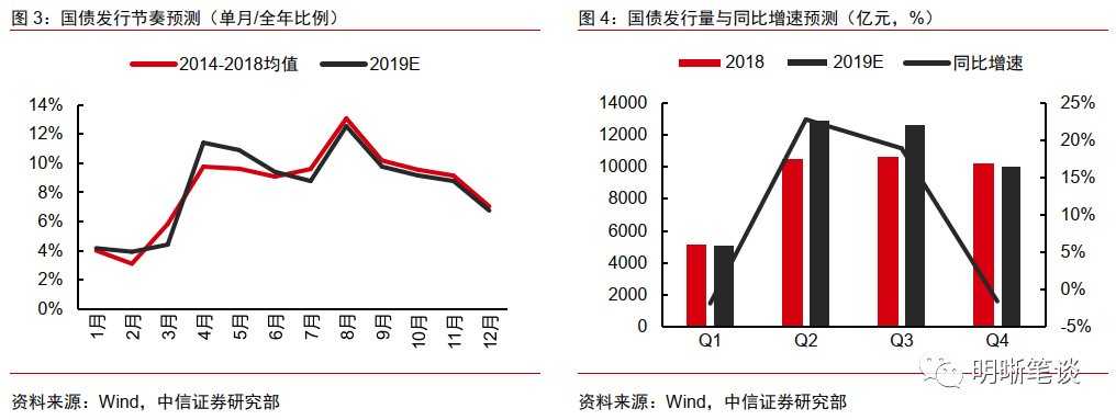 根据国债历史上的发行节奏预测,8月份是国债供给的高峰。近几年国债的发行节奏较为稳定,因此,参考2014年至2018年国债发行数据,预测8、9、10、11、12月国债发行量在全年的占比分别为12.55%、9.77%、9.16%、8.78%、6.75%,预测2019年第三季度国债发行量为1.27万亿元,同比增加18.95%;预计2019年第四季度国债发行量为10083亿元,同比减少1.63%,即8月与9月国债的供给压力较为集中。