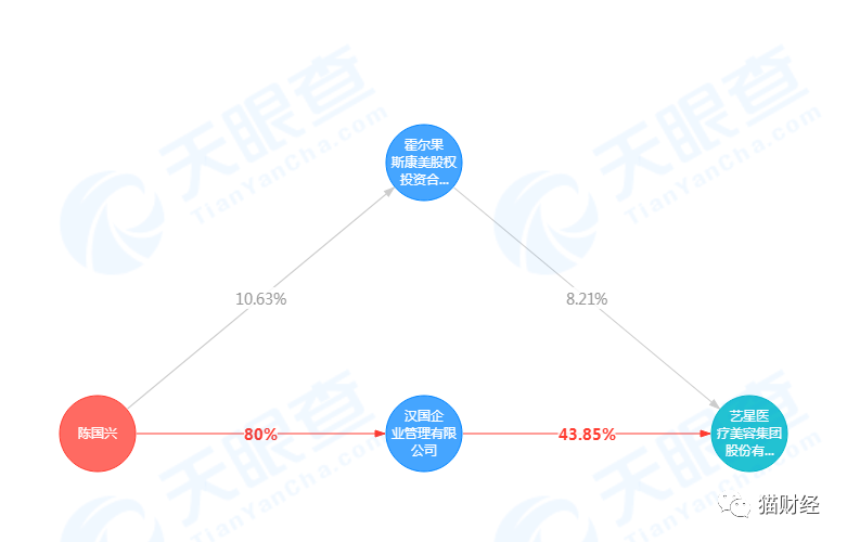 天眼查显示,陈国兴、陈国雄是艺星医美的最终受益人,两人都是莆田“四大家族”中陈氏家族的一员,前者通过汉国企业管理有限公司、霍尔果斯康美股权投资合伙企业(以下简称:康美投资)合计持有艺星医疗35.95%的股份,是公司实控人。