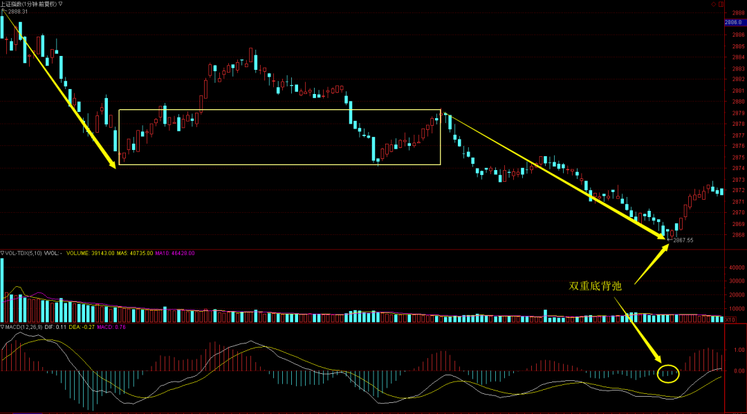 然后切换到1分钟图中,可以看到是一个盘整背驰,后面下跌的力度明显比中枢前早盘的那波下跌力度弱。而且在最低点处出现了MACD的底背弛,这是一个双重区间套,后面则引发了V反转。