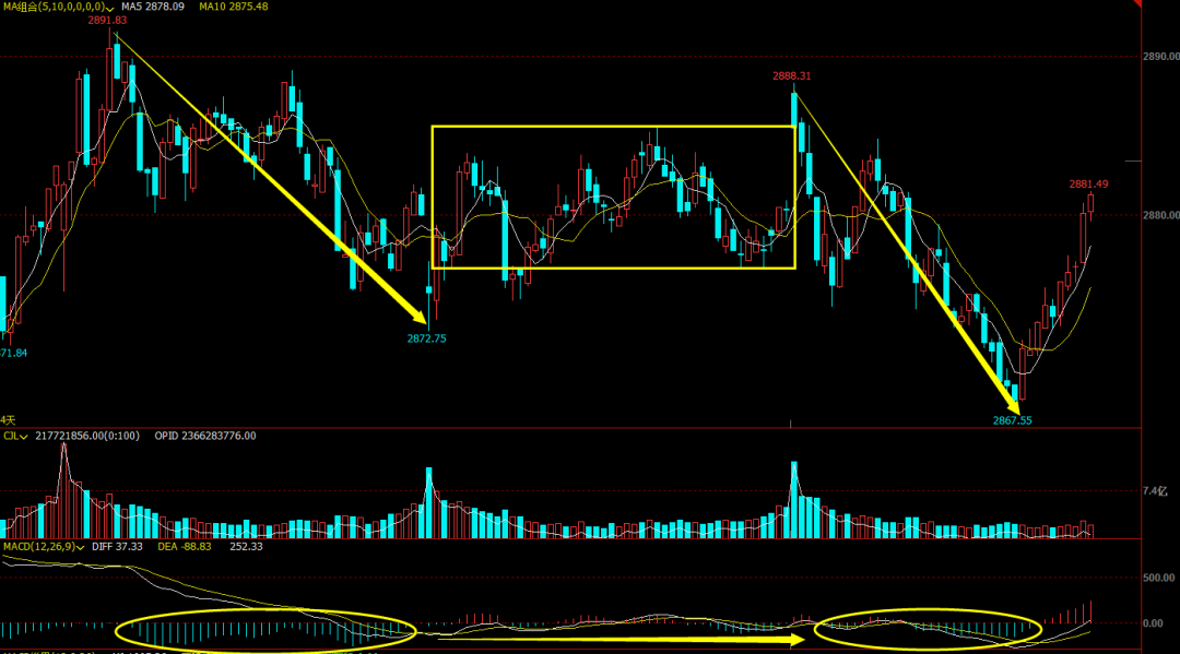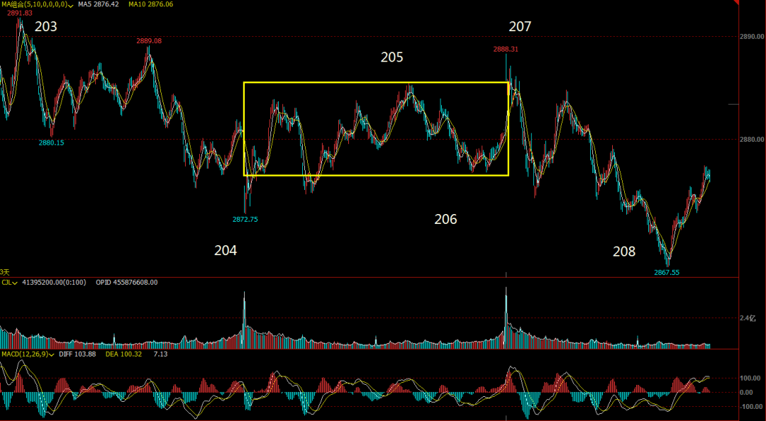 第三步:在这波离开日内中枢的走势内部如果出现背驰特征,则基本就是日内的高低点
