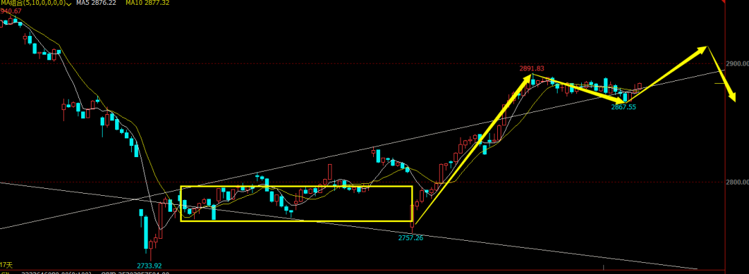 明天有望向上突破2900点回补缺口,并挑战日线上的那个下降趋势线。但由于2757点上来的这波力度较大,所以5分三买后的这个幅度不抱太大期望,还有很大可能会形成盘背,从而扩展出第二个5分中枢,这是一个预判,如果没有重量级板块的大涨,大盘按照这个剧本走的可能性很大。