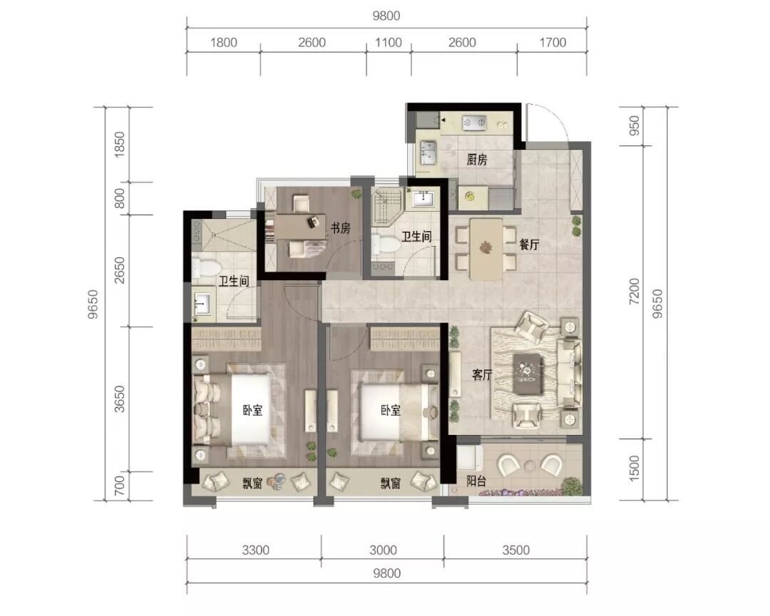 最神奇的是约137㎡四房两卫,一体化设计的餐客厅,大飘窗有6.8米长,霸气地将东边套的采光与取景框都拓到极致,加上5.2米的进深,构成一个大方厅。