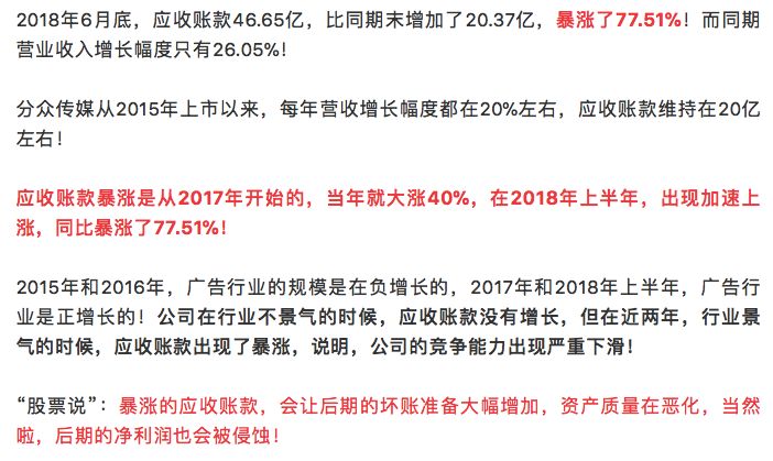 因为公司的逆势扩张,导致营业成本的大幅上涨,新增了很多低性价比的媒体点位,会持续侵蚀净利润;同时,公司在2018年暴涨的应收账款和新增的巨额应收账款,导致的持续高额坏账计提,也在侵蚀净利润。