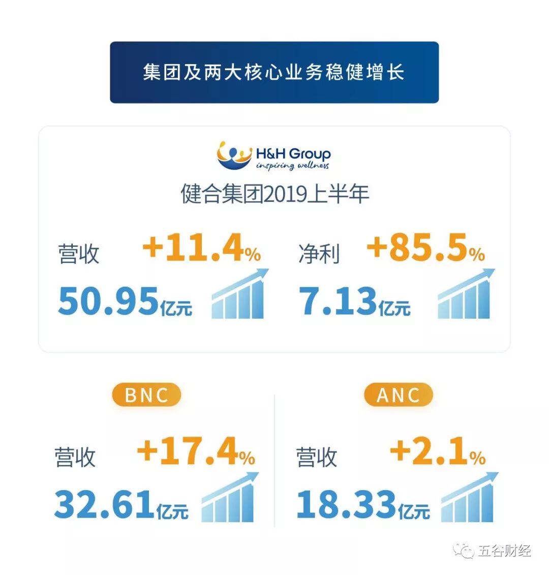 据悉,健合集团2019年上半年,集团营收达50.95亿元同比增长11.4%,净利增加85.5%至7.13亿元。其中,婴幼儿营养及护理用品业务(BNC)与去年同期相比增长17.4%达32.61亿元,成人营养及护理用品业务(ANC)与去年同期相比增长2.1%达18.33亿元。