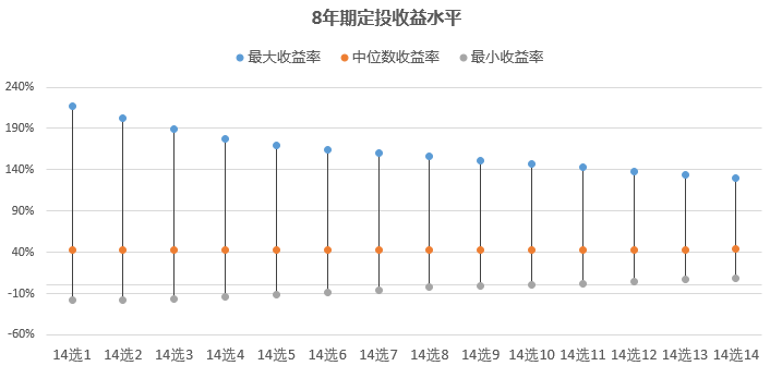 1年期、5年期、8年期定投的收益率中位数,随着定投组合基金数量增加而递增;
