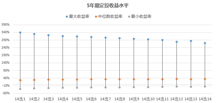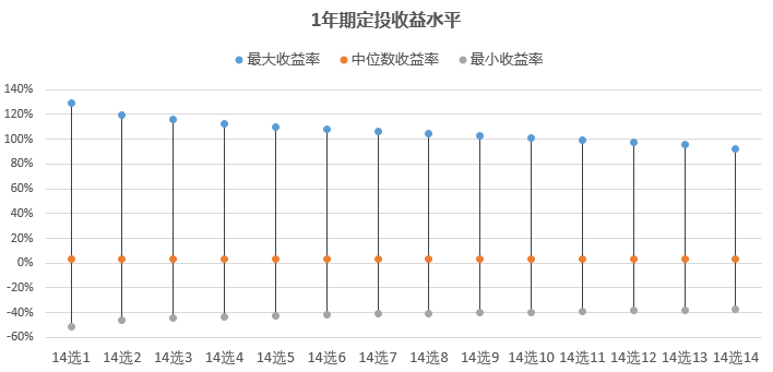 为了得到尽可能多的样本,我们在这14只基金中,任意选取1只、2只、3只…14只基金作为定投组合,进行测算。