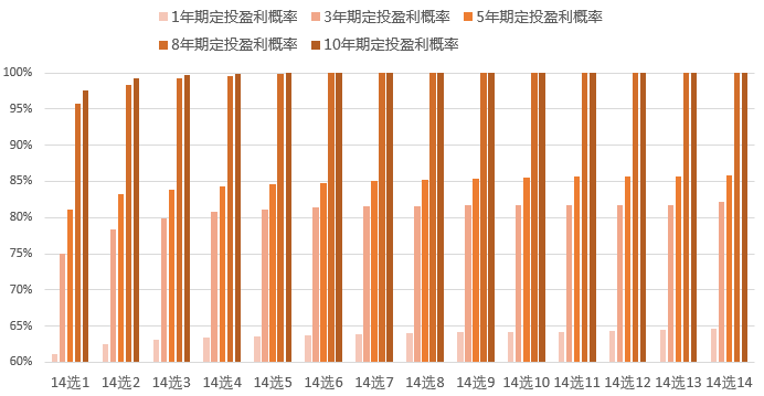 以3年期定投为例,14只基金中任意选1只的定投盈利概率为74.96%,任意选4只的盈利概率为80.73%,如果将14只基金作为一个定投组合,盈利概率为82.12%。