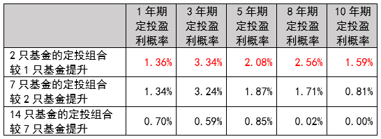 以5年期定投为例,2只基金的定投组合盈利概率较1只基金提升2.08%,而7只基金的定投组合较2只基金提升1.87%,14只基金的定投组合较7只基金仅提升0.85%。