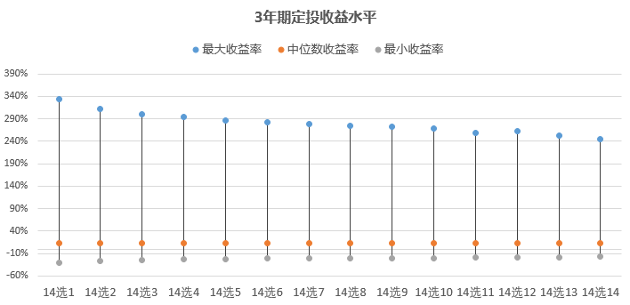 3年期定投的收益率中位数,随着定投组合基金数量增加而递减。