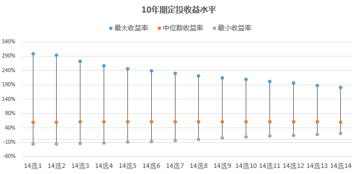 此外,从象征平均收益水平的收益率中位数来看,基金数量更多的定投组合并没有明显优势。
