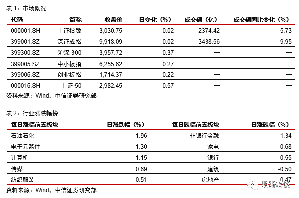 2019年9月16日,银存间质押式回购加权利率大体下行,隔夜、7天、14天、21天和1个月分别变动了-3.12bps、-5.24bps、-11.11bps、7.5bps和-4.07bps至2.34%、2.59%、2.58%、2.87%和2.88%。国债到期收益率涨跌互现,1年、3年、5年、10年分别变动-0.51bps、1.21bps、-0.33bps、0.50bps至2.60%、2.76%、2.98%、3.09%。上证综指下跌0.02%至3,030.75,深证成指下跌0.02%至9,918.09,创业板指上涨0.22%至1,714.37。