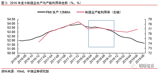 2018年4月-12月,投资与产出分化的原因可能在于政策红利带动企业设备购置热情,但疲弱的需求仍制约企业的生产热情,这也一定程度上引起了制造业产能过剩。事实上,从2018年全年看,终端需求仍维持在偏弱的水平,无论是社零同比增速还是PMI新订单指数均在处于下行期,在一定程度上对企业扩产形成制约,因此生产和产出并未大幅好转。而投资增加的原因之一可能是政策利好下企业投资热情回升,但政策对供给侧的影响要高于对需求端的带动,这也就导致了企业投资走强,但生产、产出走弱的局面,进一步看,这种组合也将导致企业新购置的设备闲置并进一步加剧了产能过剩。2018年制造业产能利用率的回落也能在一定程度上印证我们的观点,2017年12月制造业产能利用率为78.5%,而截至2018年12月产能利用率已回落至76.5%。