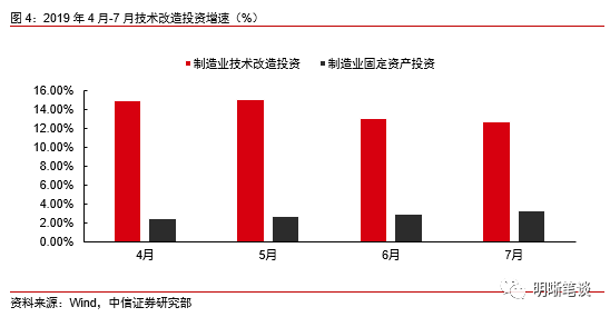 技术改造投资高增撬动制造业投资向好,但对制造业产出的带动效果相对较弱。细分固定资产投资来看,可以将其固定资产投资分为新建、扩建和改建三类项目投资,2019年4月-7月改建投资上行了1.0pcts,高于新建投资的变化0.5pcts和扩建投资的变化-4.0pcts,而由于新建项目和扩建项目直接对应新的生产设备,对产能的直接带动作用更强,而改建项目对产能的直接促进作用较弱,因此原因之一可能是,制造业投资的回升更多是受改建项目所带动。而统计局公布的制造业技术改造数据也印证了我们的观点,2019年1-4月,制造业技术改造投资累计增长14.9%,高于制造业投资12.4pcts;而截至1-7月,制造业技术改造仍保持较高增速12.7%,高于全部制造业投资增速9.4pcts。综合来看,制造业投资的回升在一定程度上受到技术改造投资所带动,但由于技术改造的周期一般较长,短期内难以带动产能快速扩张,因此导致了投资和产出的背离。